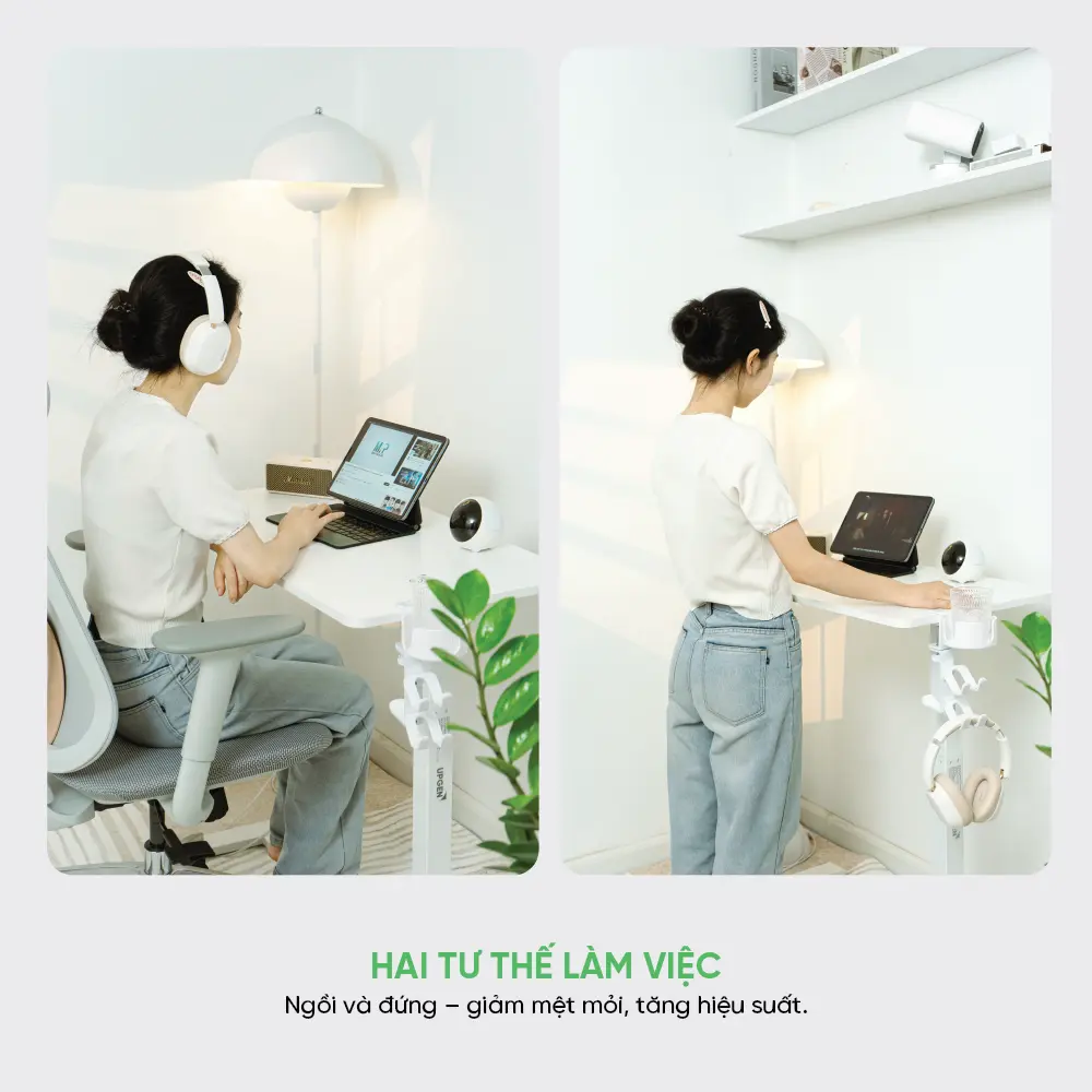 Làm việc cả ngày không còn là gánh nặng. UPGEN StandGo cho phép bạn luân phiên giữa tư thế ngồi và đứng một cách dễ dàng, giúp cải thiện tuần hoàn máu, giảm áp lực cho cột sống và nâng cao năng lượng làm việc.