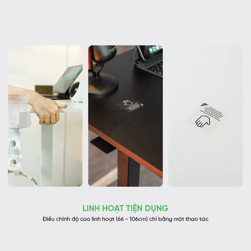 Dễ dàng nâng hoặc hạ mặt bàn từ 66cm đến 106cm chỉ bằng một thao tác. Dù bạn cao hay thấp, dù làm việc ngồi ghế hay đứng cạnh sofa – StandGo đều sẵn sàng đáp ứng.
