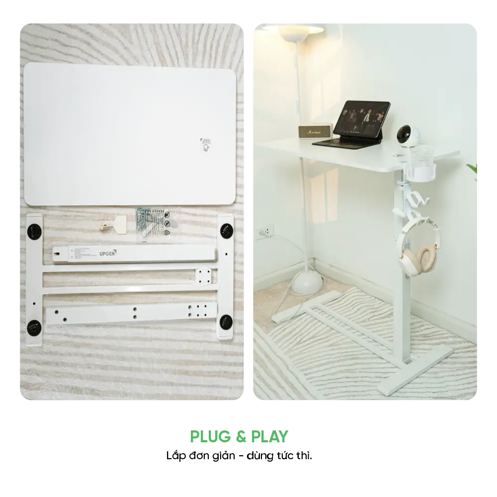 Không cần công cụ phức tạp hay lắp đặt cầu kỳ. UPGEN StandGo được thiết kế để bạn có thể sử dụng ngay sau khi mở hộp. Cắm điện – và bắt đầu làm việc.
